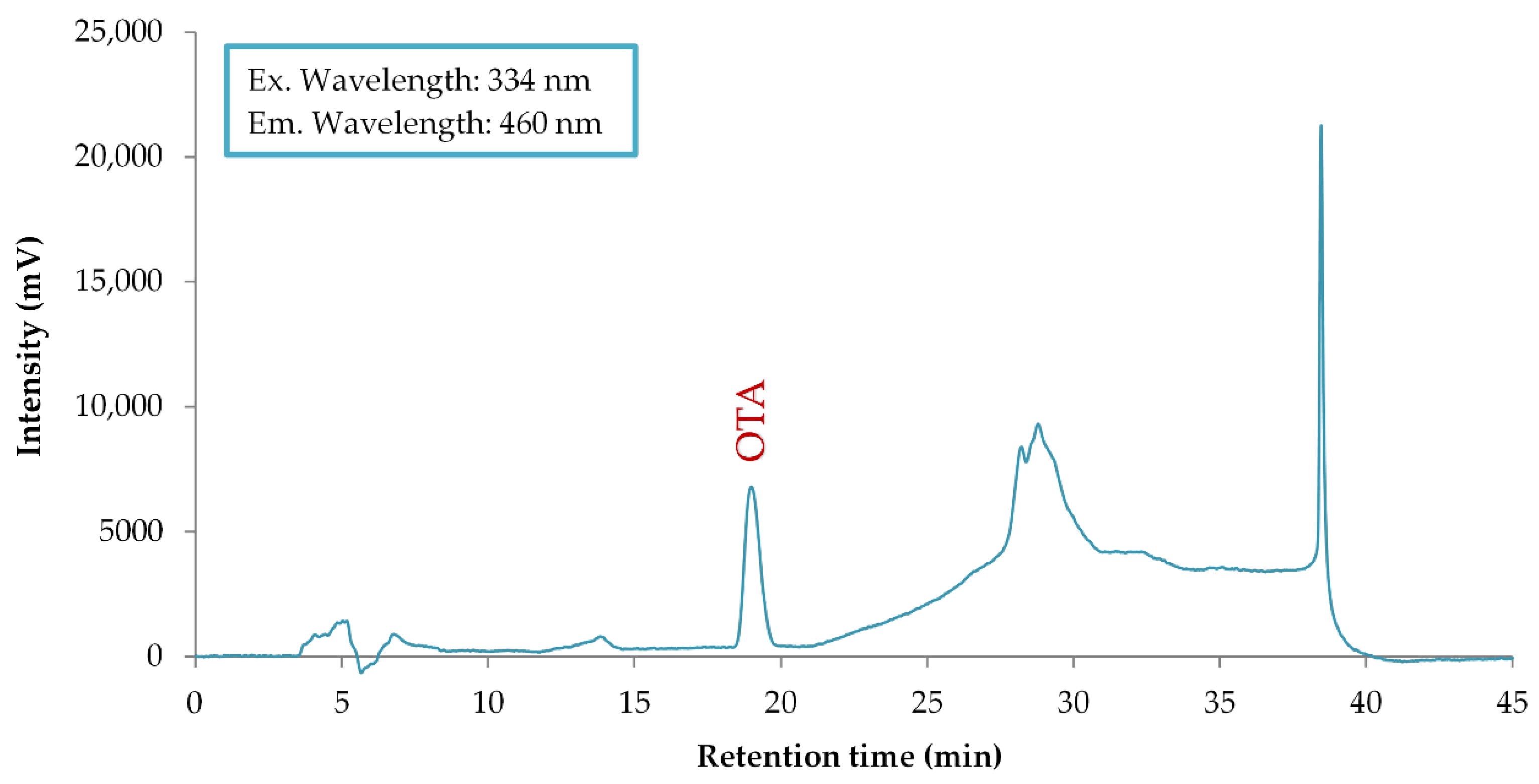 - Wei, D.; Wu, X.; Xu, J.; Dong, F.; Liu, X.; Zheng, Y.; Ji, M. Determination of ochratoxin A contamination in grapes, processed grape products and animal-derived products using ultra-performance liquid chromatography–tandem mass spectrometry. Sci. Rep. 2018, 8, 2051. [Google Scholar] [CrossRef]