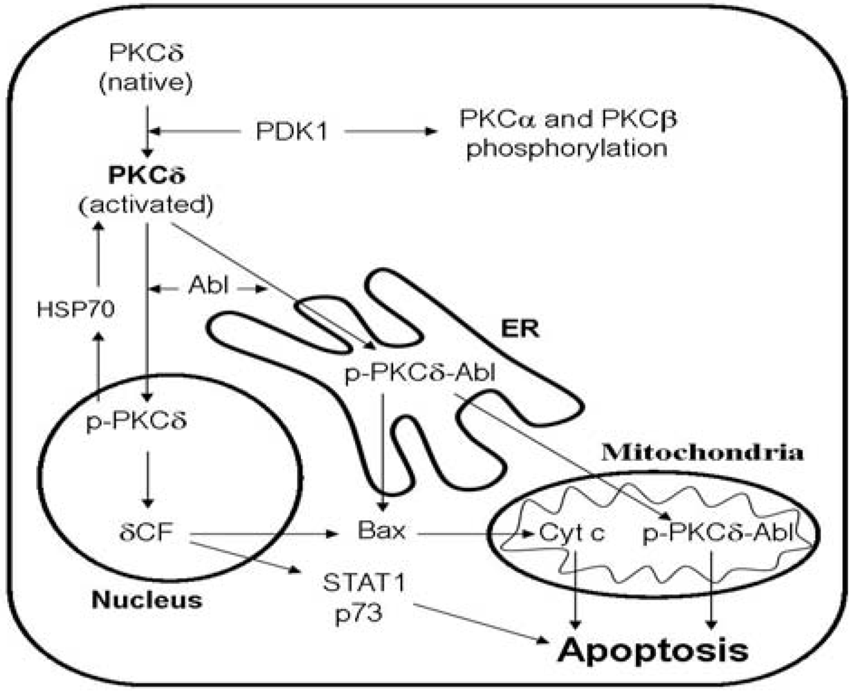 Intracellular compartmentalization of PKCδ. Phosphoinositide dependent kinase 1 (PDK1) is responsible for the initial activating phosphorylation of PKCδ; this enzyme can also phosphorylate PKCα and PKCβ as an initial activating event for these enzymes. If a pro-apoptotic signal is involved the activated PKCδ is thereafter translocated either to the nucleus or to the endoplasmic reticulum (ER). After nuclear translocation caspase 3 cleavage results in the formation of the δCF fragment that has a pro-apoptotic effect either (i) via upregulation of Bax and subsequent mitochondrial release of cytochrome c, or (ii) via the cytoplasmatic mediators STAT1 and p73. Alternatively, the activated PKCδ can be exported from the nucleus by a mechanism involving dephosphorylation and subsequent molecular stabilization by Heat shock protein 70 (HSP70). The translocation to ER is initiated through cytoplasmatic association of activated PKCδ with the Abl kinase; this results in PKCδ phosphorylation and translocation of the p-PKCδ-Abl complex to ER where pro-apoptotic signaling is initiated either through Bax or through further translocation of the complex to the mitochondria [11,45,46,47].