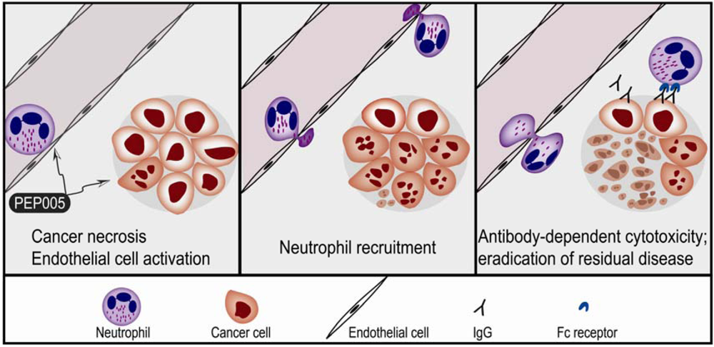 Effects of PEP005 in experimental skin cancer. (LEFT) Topical application of PEP005 causes high local drug concentrations with two direct effects; endothelial cell activation with neutrophil adhesion; and (ii) direct induction of necrosis in the malignant cells. (MIDDLE) There is transmigration and local neutrophil recruitment with a local inflammation. (RIGHT) Finally there is an antitumor humoral immune response leading to antibody-dependent cytotoxicity and eradication of residual cancer cells.