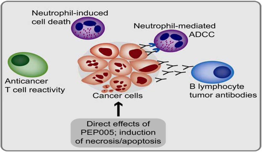 Topical treatment of skin tumors with PEP005 induces cancer cell necrosis followed by local inflammation characterized by neutrophil infiltration and release of reactive oxygen species [55]. The treatment also increases the levels of antitumor antibodies and thereby enhances tumor cell killing by antibody-dependent neutrophil cytotoxicity. The following observations have been made after implantation of tumor cells in mice followed by topical PEP005 treatment [3,55]: