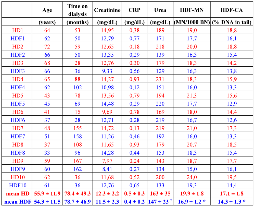 Patient characteristics, selected plasma parameters and markers of genotoxicity of matched patients on hemodialysis (red) and hemodiafiltration (blue). HD: hemodialysis; HDF: hemodiafiltration; CRP: C reactive protein; MN: micronuclei; BN: binucleated cells; CA: comet assay; 1–10: patient numbers. Methods used to obtain these data are explained in [64]. * p < 0.001 vs. HD; + p = 0.074; paired t-test (SPSS 18).