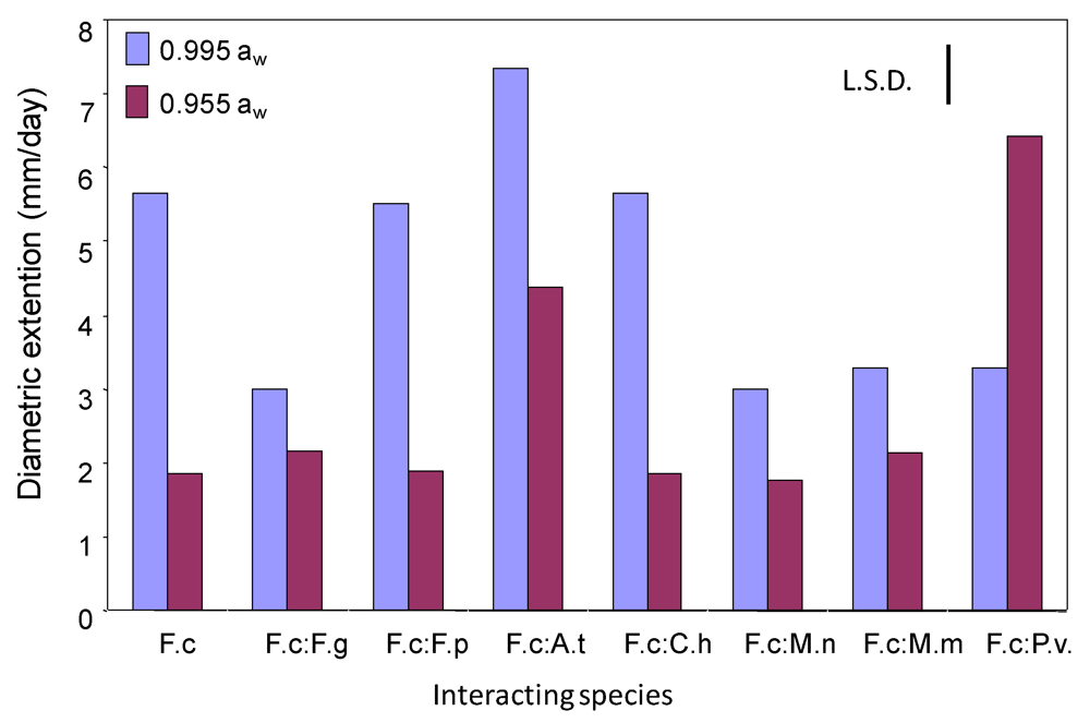 Comparison of the effect of interactions on relative growth rate of F. culmorum when in dual culture with different wheat grain fungi at 0.995 and 0.955 water activity at 25 °C on wheat grain. Key to fungi: F.c, F. culmorum; F.g, F. graminearum; F.p, F. poae; A.t, A. tenuissima; C.h, C. herbarum; M.n, M. nivale; M.m, M. nivale var majus; P.v, P. verrucosum. L.S.D., Least significant difference at P = 0.05.