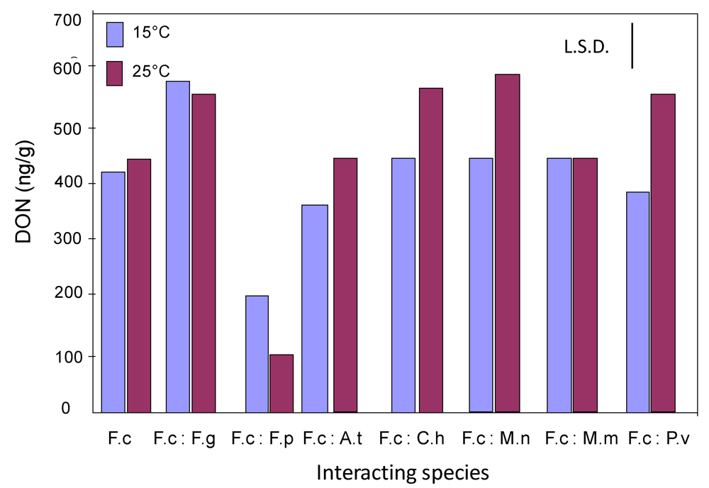 Comparison of the amount of DON produced by F. culmorum alone and when interacting with different wheat grain fungi at 0.955 water activity at 15 and 25 °C. Key to fungi: F.c, F. culmorum; F.g, F. graminearum; F.p, F. poae; A.t, A. tenuissima; C.h, C. herbarum; M.n, M. nivale; M.m, M. nivale var majus; P.v, P. verrucosum. L.S.D., Least significant difference at P = 0.05.