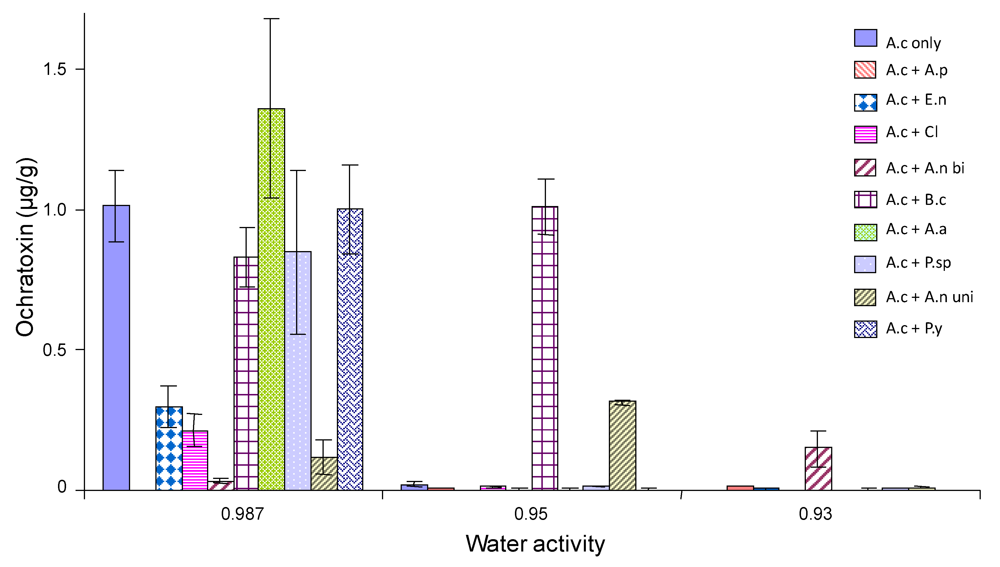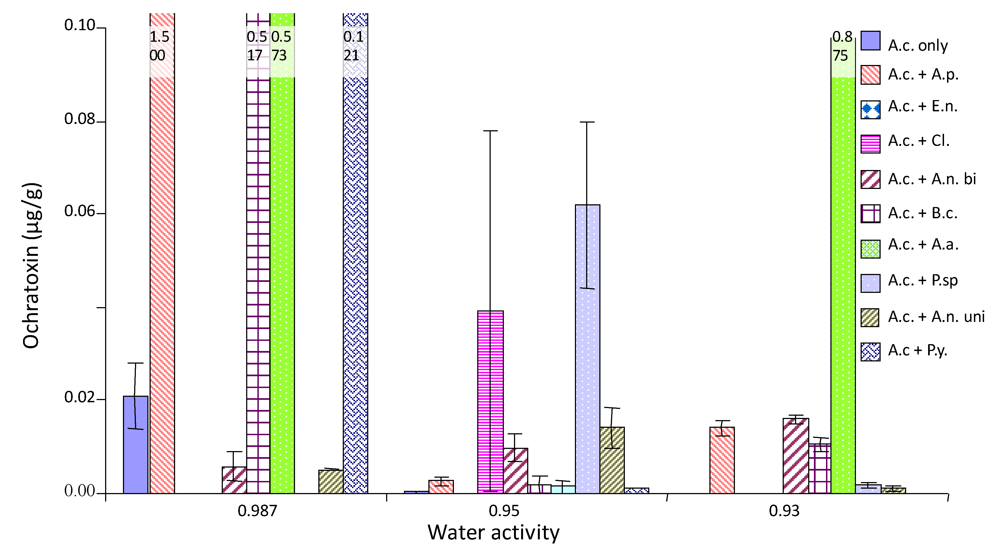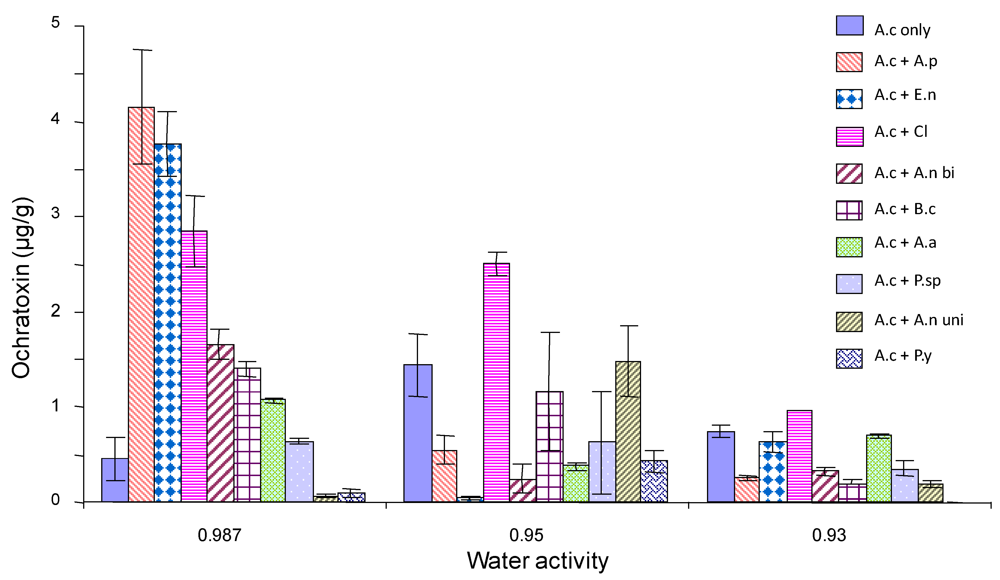 Ochratoxin production by A. carbonarius at 20 °C when grown against grape vineyard fungi. Grown on Synthetic grape juice medium at 0.93-0.987 aw levels. Bars indicate standard error of the mean. Key to species A.c; A. carbonarius, A.p; A. pullulans,E.n; E. nigrum,Cl; Cladosporium species,A.n bi; A. section Nigri biseriate,B.c; B. cinerea, A.a; A. alternata, P.sp; Phoma species, A.n uni; A. section Nigri uniseriate, p.y; Pink yeast.