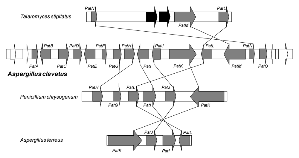 Patulin gene cluster in A. clavatus and comparison of secondary metabolite gene clusters in three other fungi species that contain some genes related to patulin production. Grey indicates genes of the patulin cluster; white indicates genes adjacent to the patulin cluster. The black arrows in T. stipitatus represent genes that are not present in the patulin gene cluster.