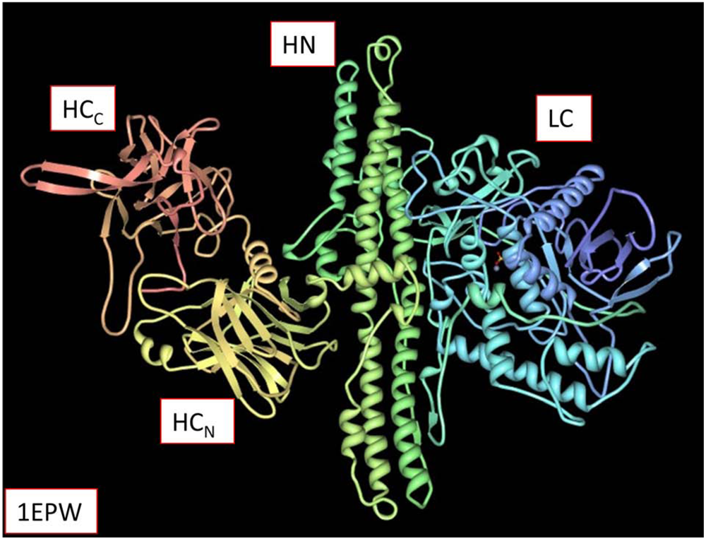 The heavy chain (HC, ~100 kDa) has three structurally dissimilar domains. The so-called C-fragment is composed of two all-b domains (HCC and HCN, ~50 kDa; far left-hand side of Figure 1, red and yellow-orange). Together, the HC domains recognize and bind to nerve terminals in a serotype specific manner using proteins, gangliosides or other macromolecules as receptors [25]. The other domain (HN, ~50 kDa, green) is mainly a-helical (middle portion of Figure 1) and assists in the receptor-mediated internalization and translocation of the toxic moiety [26]. This multistep mechanism of neurotoxin action was first enunciated by Simpson (1980) [27] and has been kinetically modeled [27,28]. It is worth emphasizing that these neurotoxin molecules are not merely proteases. Rather, they are naturally occurring nano-scale machines [11] that bind and enter into cholinergic nerve endings to deliver their enzymatic cargos. The BoNTs are highly selective for their substrates, which regulate vesicle-mediated neurotransmission.