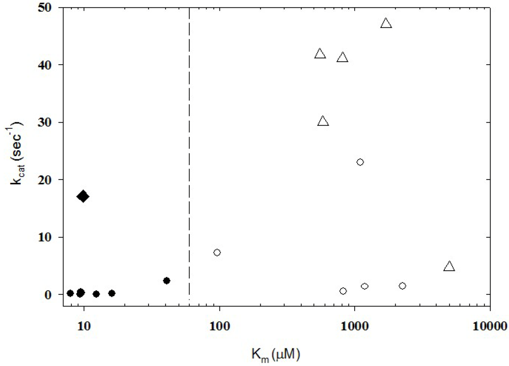 Values of Km and kcat obtained from cell-free assays depend on the forms of the toxic moiety and the substrate molecule used. The LC of BoNT/A (LC-A) and full length SNAP-25 (residues 1-206) are associated with values of Km (closed symbols) that are less than those associated with the LC-A and a 17-mer of SNAP-25 (residues 146-206; open symbols). Larger values for kcat tended to be associated with a 17-mer of SNAP-25 and the holotoxin (open triangles). Open circles: LC-A used with 17-mer SNAP-25 fragment; closed circles: LC-A used with full-length SNAP-25 (1-206) containing His-6 tag. Closed diamond: data associated with the largest kcat/Km ratio in this data set (see text). Dashed vertical line: arbitrarily positioned below Km = 100 mM to visually separate high and low values of Km. Data collected from [48,49,50] and references therein.