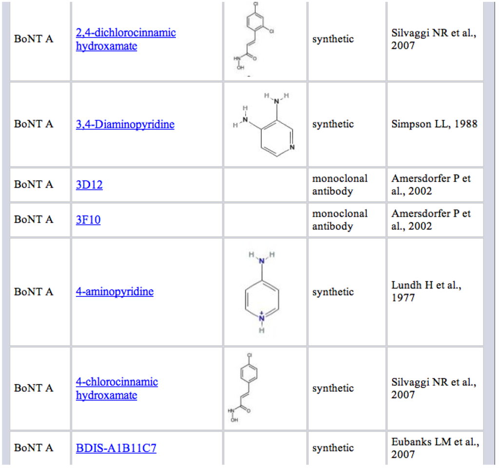 Within the BotDB resource, the BotDBI section has information on more than 60 inhibitor candidates including peptides, synthetic and natural compounds, and monoclonal antibodies, along with references. Searches for candidate inhibitors can be done by author name, value of IC50, inhibitor site, inhibitor type, value of Ki, inhibitor name PubMedID BoNT serotype, and inhibitor structure. An example of a list of synthetic compounds in the BotDBI section is shown in Figure 3.