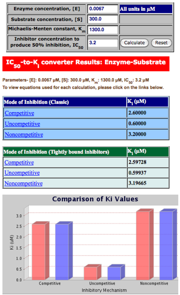 Output of the IC50-to-Ki converter tool at the BotDB website that shows the different possible results based on whether the inhibitor mechanism is competitive, uncompetitive or noncompetitive.