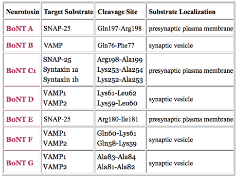 A summary of the BoNT serotypes, their target SNARE proteins, their intracellular compartments and the cleavage site locations. This table is available at the BotDB website.