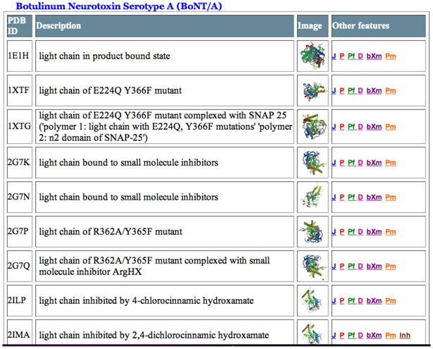 a Abbreviations in the right most column are linked to various sites: J, Jmol graphics program; P, PDB website; Pf, PDB file; D, DSSP Summary; bXm, literature reference from botXminer; Pm, PubMed; Inh, inhibitor.