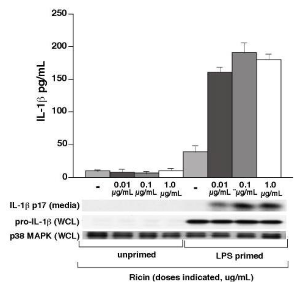 Previously we demonstrated that, in addition to inhibiting protein synthesis, ricin triggers the phosphorylation of JNK and p38 MAPK. Activation of these kinases is required for ricin-mediated expression of mRNAs encoding inflammatory cytokines and chemokines [38,39]. Furthermore, we showed that ricin administration to the lungs results in a neutrophilic inflammation in vivo that is dependent on IL-1β and on the presence of macrophages [6]. Experiments in BMDM and alveolar macrophages demonstrated that macrophages constitute primary targets for ricin, and are a likely source of ricin-induced production of IL-1β [3,5,6]. However, the mechanism of ricin-mediated processing and release of IL-1β was unclear.