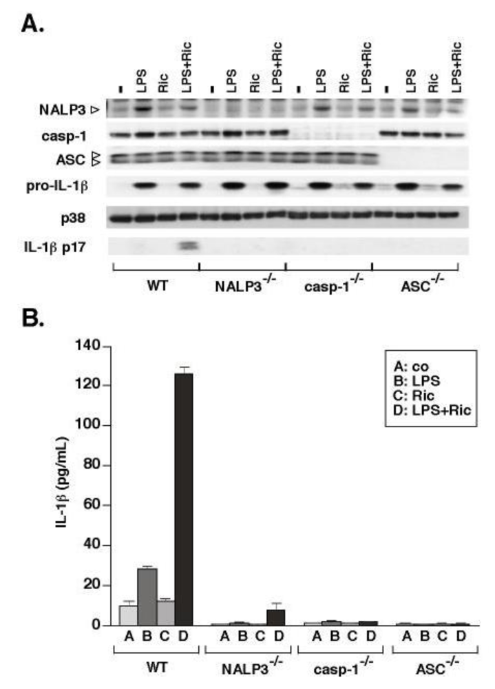 Secretion of processed IL-1β from cells requires discrete events, including the accumulation of pro-IL-1β through a priming step and the assembly of the inflammasome, a multiprotein scaffolding complex that both activates caspase-1 and brings caspase-1 into close proximity with pro-IL-1β [7,10]). The best-studied inflammasome complex is the NALP3 inflammasome, in which NALP3 associates with caspase-1 through the adaptor protein ASC [12,13]. The NALP3 inflammasome has been shown to mediate cellular responses to several danger-associated molecular patterns: exogenous danger signals such as silica and asbestos [19,21], and endogenous danger signals such as ATP and uric acid [22,23,36]. To determine if macrophages sense and respond to ricin through the NALP3 inflammasome, we compared the ricin-mediated responses of WT cells to responses of cells deficient in NALP3, ASC, or caspase-1 (Figure 2). BMDM from each mouse strain were primed with LPS for 4 h prior to ricin treatment. After 4 h exposure to ricin, cells were harvested and processed for immunoblotting (Figure 2A) to examine expression levels of inflammasome components and pro-IL-1β. Media supernatants were subjected to detection of IL-1β by immunoblotting and ELISA (Figure 2B). Although pro-IL-1β was similarly induced in the LPS-primed cells of each strain, the processing of pro-IL-1β to active IL-1β was significantly decreased in cells deficient in either NALP3, ASC or caspase-1. These results suggest that the NALP3 inflammasome is required for ricin-mediated IL-1β processing and release from BMDM.