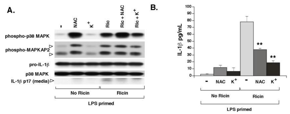 Elevated extracellular K+ and NAC prevent ricin-mediated secretion of IL-1β from WT BMDM. Primed WT cells were treated ± 0.01 µg/mL ricin in combination with either NAC or K+ for 4 h. A) WCLs were subjected to immunoblotting for phospho-p38 MAPK, phospho-MAPKAP2, pro-IL-1β and p38 MAPK as a loading control. Media supernatants were either precipitated for immunoblotting (A) or subjected to ELISA for determination of secreted IL-1β (B). Bars represent the mean ± s.d. of triplicate wells (**: p < 0.01).