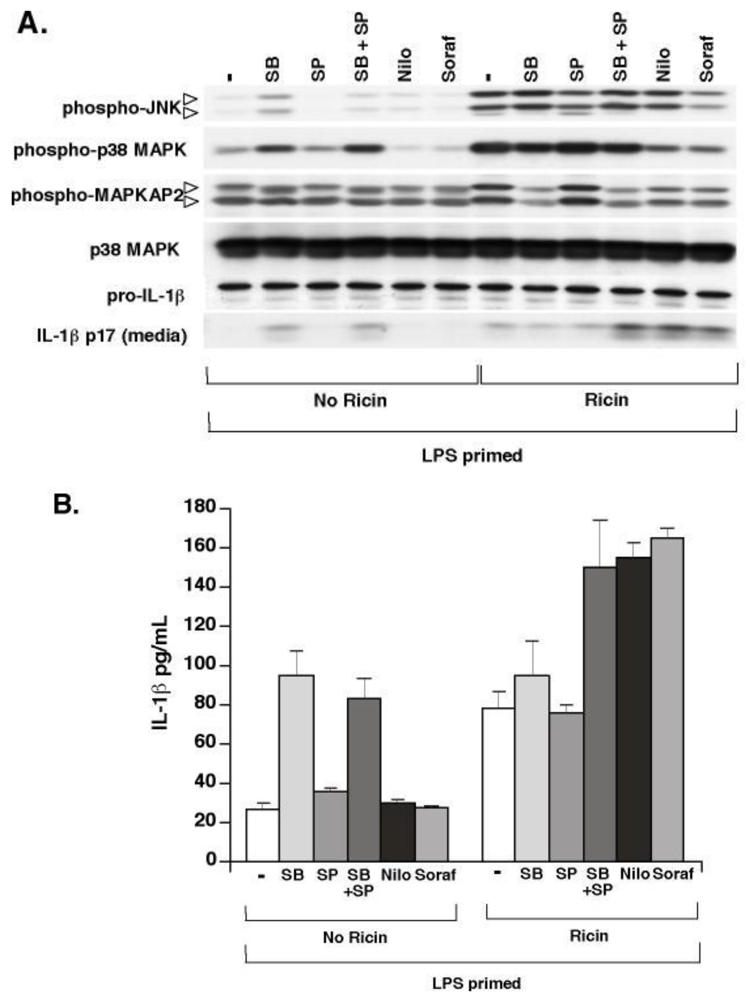If ricin-mediated phosphorylation of SAPKs is an upstream event leading to NALP3 activation, then blocking the phosphorylation of these kinases should prevent the appearance of IL-1β in the media of ricin-treated cells. To address this question we employed SB203580, an inhibitor of p38 MAPK, and SP600125, an inhibitor of JNK. We also employed two inhibitors (Nilotinib and Sorafenib) that have been reported to have very high affinity for the ATP-binding site of ZAK [34,35], the upstream MAP3K that is phosphorylated by ricin and other ribotoxic stressors [33]. LPS-primed cells were treated with SB203580 (SB), SP600125 (SP), Sorafenib, Nilotinib or ricin, alone and in combination for 4 h, at which time cell lysates and media supernatants were collected (Figure 4). Phosphorylated SAPKs and pro-IL-1β levels were examined in cell lysates by immunoblotting. Processed IL-1β from media supernatants was detected using both immunoblotting and ELISA. Inhibitors exhibited varying degrees of effectiveness in suppressing SAPKs. JNK activation was decreased marginally by SP and significantly by Sorafenib; p38 MAPK activation was diminished significantly by Nilotinib and Sorafenib; and the activation of MAPKAP2, a target of p38 MAPK, was significantly decreased by SB, Nilotinib, and Sorafenib. Surprisingly, SB stimulated IL-1β release from macrophages on its own, and cells co-treated with kinase inhibitors and ricin secreted similar or greater amounts of IL-1β as cells treated only with ricin, despite diminished levels of phosphorylated p38 MAPK and JNK in these cells. These data suggest that SAPK activation by ricin is not a requirement for the release of IL-1β from ricin-treated cells and that suppression of ricin-mediated ZAK activation did not reduce ricin-induced activation of the NALP3 inflammasome.