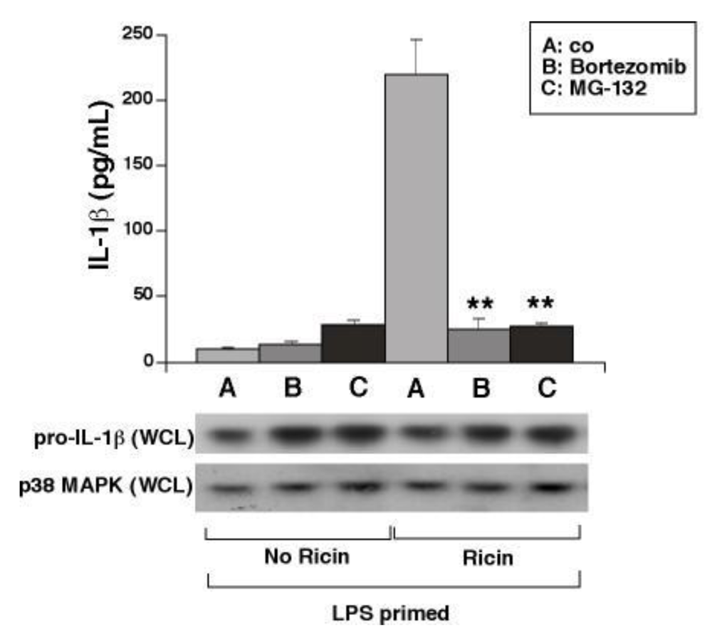 Importantly, the dose of ricin used in this study (0.01 µg/mL) elicits a 50% inhibition of protein synthesis by 3 h in addition to its effects on SAPKs and the release of IL-1β [3]. We hypothesized that inhibition of protein synthesis per se could lead to activation of NALP3 by contributing to the disappearance of labile proteins which may regulate the availability of NALP3 to participate in formation of the inflammasome. In such case, proteasomal activity may be required for ricin-induced activation of NALP3 and release of IL-1β from macrophages. To test this hypothesis, we employed the specific and potent proteasome inhibitors bortezomib and MG-132. Although cells exposed to bortezomib or MG-132 expressed similar levels of pro-IL-1β to cells exposed only to LPS or ricin, cells exposed to bortezomib or MG-132 exhibited complete suppression of ricin-mediated secretion of IL-1β (Figure 5). These data are consistent with the notion that translational inhibition itself may be a mechanism by which ricin triggers IL-1β dependent inflammatory signaling.
