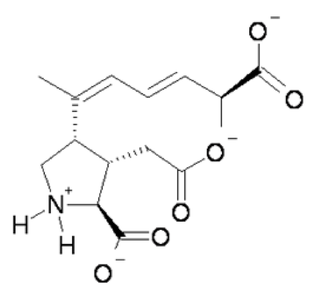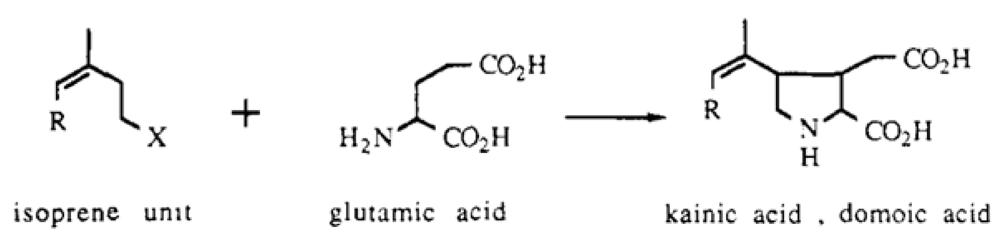 Domoic acid and the structurally related compound kainic acid were discovered in several red macroalgal (Rhodophyta) seaweeds that had been used for traditional medicine since the ninth century in Japan [9,10]. These unique chemical structures have been proposed to be analogs of the neurotransmitter L-glutamate condensed with one or two isoprene units to form the side chain. Fusion of the first isoprene unit with the amino group forms the pyrrolidine ring (Figure 6) [11]. Subsequent isotopic enrichment studies have supported this biosynthetic origin and further indicated that alpha-ketoglutarate may serve as the source of glutamate for biosynthesis [12]. Kainic acid, isolated from a more plentiful seaweed, quickly gained recognition as a potent excitotoxin and found popular use as an experimental tool and model agent for epilepsy research [13,14,15]. Domoic acid, isolated from a rarer source of seaweed, was sparsely investigated until it was briefly examined for its strong insecticidal activity [16] three years in advance of its recognition as the causative agent of a human outbreak of neurotoxic poisoning in Montreal, Canada [17,18].