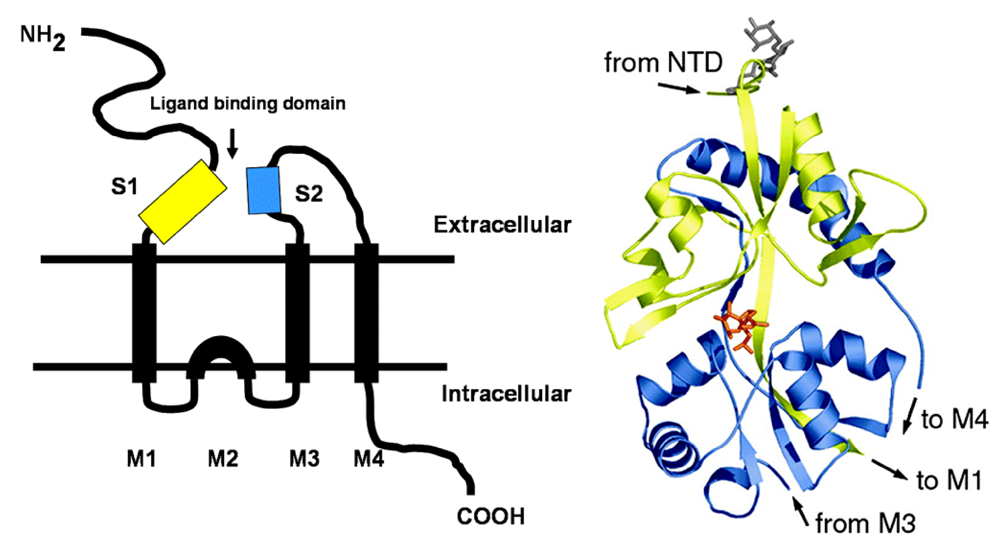 Left: Schematic of ionotropic gluatamatergic receptor with S1 and S2 ligand binding domains highlighted in yellow and blue, respectively. Right: Minimized structure of GluR6 S1-S2 fusion protein with domoic acid shown as an orange stick figure bound between the S1 and S2 domains. Reprinted with permission from National Academy of Sciences, USA [5].