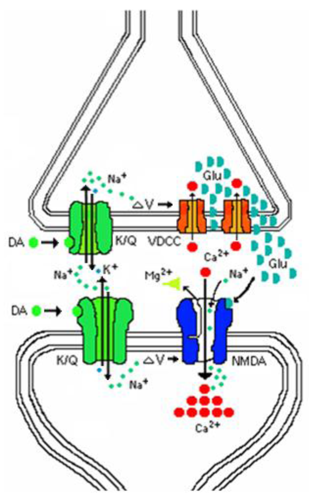 Domoic acid affects only a partial opening of the channel and it interferes with the closing, resulting in a sustained ion conduction that yields a net influx well beyond that of natural neurotransmitters. This level of excitotoxicity is reached from a coordinated action on both sides of the synapse (Figure 3). Domoic acid activates both presynaptic and postsynaptic kainate receptors leading to a sodium ion (Na+) influx and membrane depolarization. The presynaptic depolarization activates voltage gated calcium channels and elevates intracellular calcium (Ca2+), releasing glutamate into the synapse. Postsynaptic depolarization releases the magnesium (Mg2+) block of the NMDA receptor and glutamate activates the receptors causing a massive calcium flux, and thus triggering excitotoxicity.