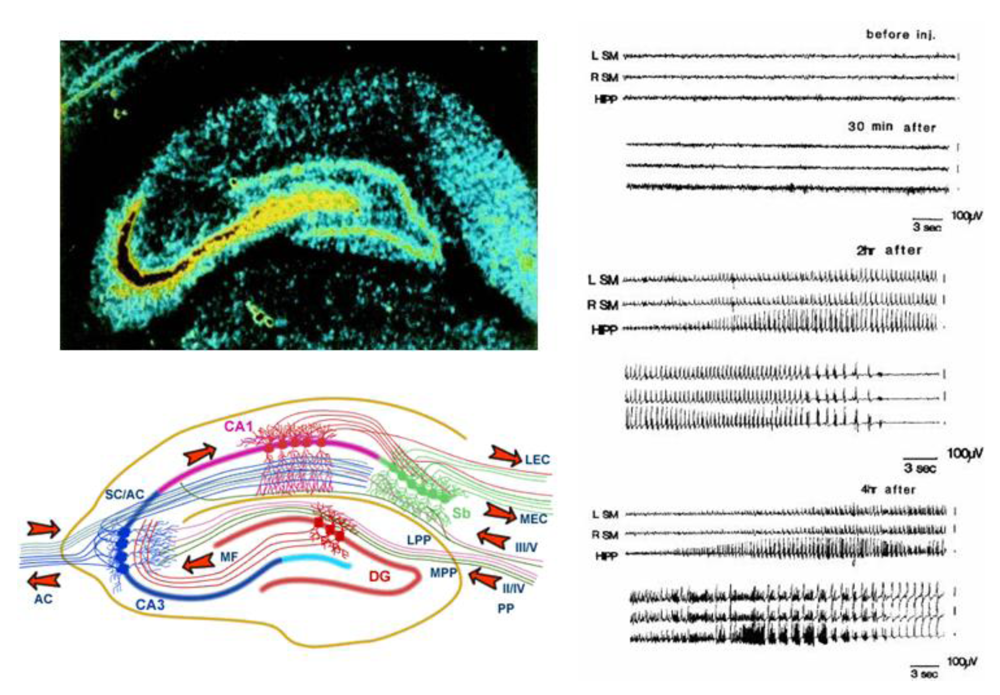 Top left: Autoradiogram of kainic acid binding sites in hippocampus. Reprinted with permission from Elsevier [6]. Bottom left: Afferent and efferent pathways of the hippocampus. Reprinted with permission from MRC Centre for Synaptic Plasticity, University of Bristol, (2005) [7]. Right: Domoic acid effects on EEG activity in rats. Reprinted with permission from Elsevier [8].