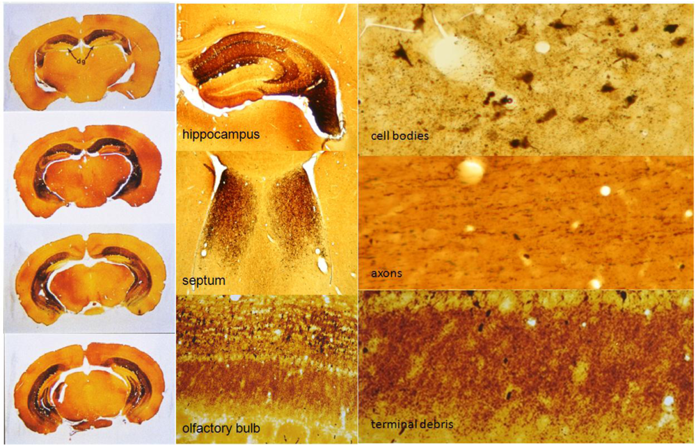 Domoic acid damage to brain assessed by cupric-silver histochemistry and viewed at three levels of magnification. Domoic acid degenerated neuronal elements are stained black via cupric-silver degeneration stain which is an advantageous method because it can be viewed at three levels of organization (full coronal section, specific brain regions and cellular detail). Degenerated pathways at the full coronal section can been seen throughout the ammon’s horn of the hippocampus (left) and limbic regions of the hippocampus, septum and olfactory bulb (center). At the cellular level, affected cell bodies appear as large black regions normally associated with terminal debris Axons appear as thin filamentous strands and were typically distal to the regions where labeled cell bodies appeared. Degenerated terminals are identified as small pinpoints, often associated with the cell bodies.
