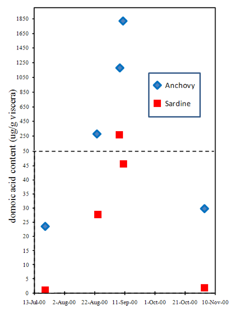 Accumulation of domoic acid in anchovies and sardines sampled at the same site in Monterey Bay, CA. Chart is plotted with data from Lefebvre et al. [40].