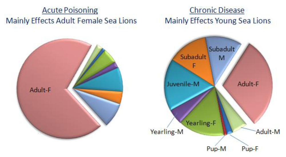 An interesting observation in analysis of epileptic syndrome in sea lions is the increased incidence of chronic disease in younger age sea lions. By contrast, acute poisoning predominates in adult females (Figure 10). The symptomatology of the epileptic syndrome differs between young and adult animals as well. One third of younger animals did not have seizures at admission and overall displayed lower grade symptoms of tremors, ataxia, or depression. The younger animals that died of epileptic syndrome had minimal or atypical neuropathological damage and not the hippocampal sclerosis and limbic system damage observed in adult sea lions. Although the difference in the response may be the younger age that the sea lions present with the disease, the poisoning during fetal life and expression of disease later in life is another possibility that has precedence from experimental investigation [74].