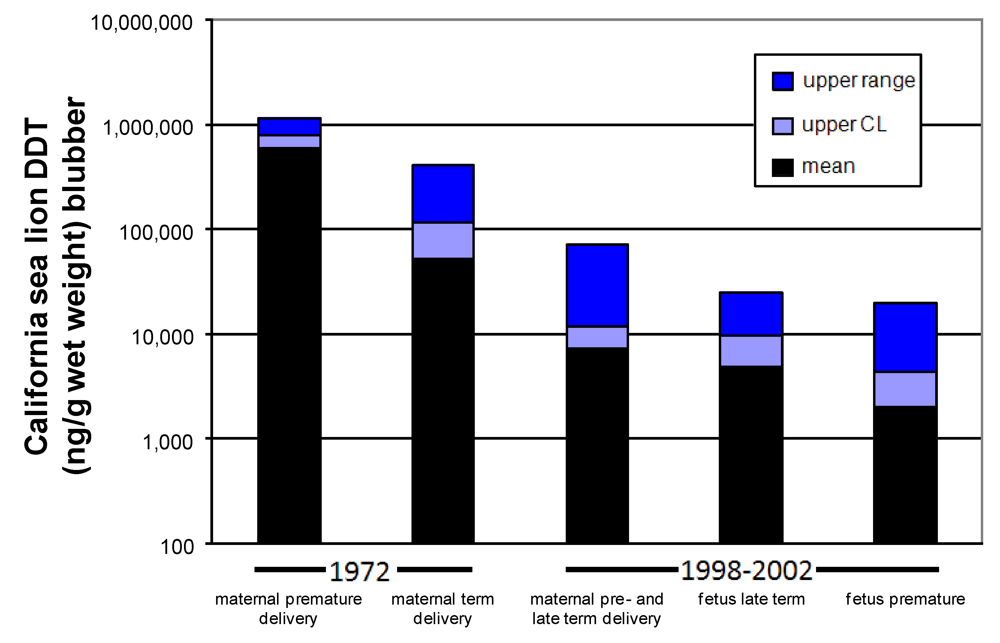 Very high organochlorine levels, including not only DDT, but also polychlorinated biphenyls (PCBs), have been associated with reproductive failure of the California sea lion. These legacy contaminants of the post WWII industrial period co-occur in both the pregnant females and fetuses of this population. Six-fold higher concentrations of DDTs and PCBs were identified in females with aborted fetuses than females with term births during a 1970 reproductive toxicity event [68]. An experimental study of this sea lion population two years later showed the same trend, with eight-times higher DDT concentrations and four-times higher PCB concentrations in those females with aborted fetuses than females with normal term deliveries (Figure 12, two bars on left) [69]. However, the identification of two co-occurring pathogens, San Miguel Sea Lion Virus and Leptospria pomona, the later associated with reproductive failure in livestock, added a confounding factor that precluded implicating a role for PCBs or DDTs in the reproductive poisoning of these sea lions [69].