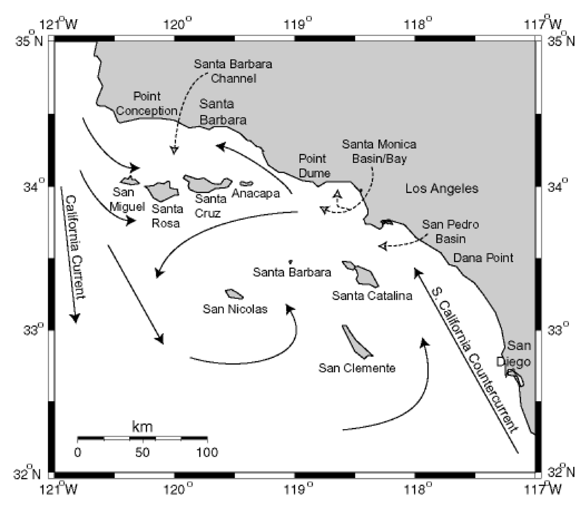Circulation patterns in the Southern California Bight. Modified from [84], Copyright (1992) [85].