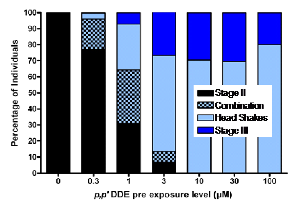 Percent of larval zebrafish responding with chemical induced seizures following embryonic exposure to concentrations of p,p’-DDE. Combination denotes those that exhibited both a definable Stage II seizure along with head shake behaviors. Data from [91].