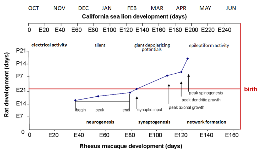 Correlation of Rat and Rhesus Monkey Neurodevelopment with Gestational Scaling to the California Sea Lion. Data from milestones of neurodevelopment in developing rat and monkey limbic brains is plotted from [97]. Scaling of fetal California sea lion development beginning with release of blastocyst from diapause projected to occur in the first week of October relative to rhesus macaque gestation is shown on top of chart. Overlay of hippocampal neurogenesis milestones is from reference [98]. Overlay of brain growth spurt is from reference [99]. The electrical activity time line is modified from rhesus macaque neurodevelopment [100] and scaled to the California sea lion.