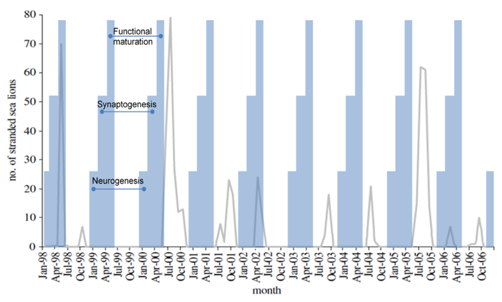 Correlation of sea lion stranding data with projected times of in utero neurodevelopment. Figure from [55] is modified with data from [74].