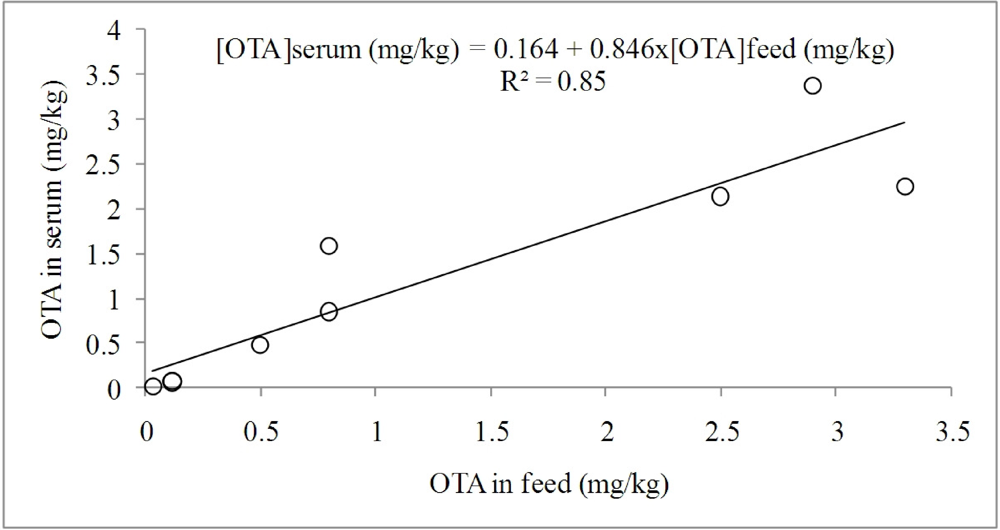 Relationship between the concentration of OTA in the diet and its concentration in pig blood serum.