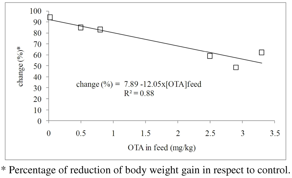 Data from experiments [41,42,43], in which a reduction of weight gain caused by the OTA feed contamination was observed, are plotted in Figure 2. Though only limited data, a significant decrease of daily weight gain for increasing OTA concentrations in feed can be observed. The equation slope indicates an average reduction of 12% in weight gain of pigs for an increase of 1 mg/kg of OTA in the diet.