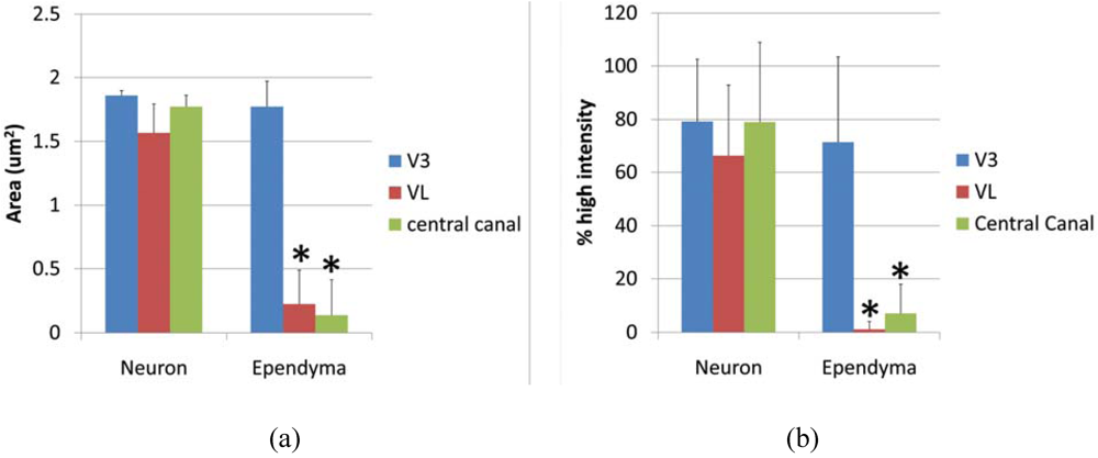 Intesnsity of anti-Gb3-Ab staining in neurons vs. ependyma. (a) High intensity area comparison of neurons and ependymal cells from V3, VL or central canal. Values from each region (neuron vs. ependyma) are compared, and the statistically significant difference is shown as (*). (b) High intensity percentage from Line profile analysis comparing neurons and ependymal cells from V3, VL or central canal. Values from each region (neuron vs. ependyma) are compared, and statistically significant differences are shown as (*). * indicates p < 0.01 in 2-tailed, paired t-test.