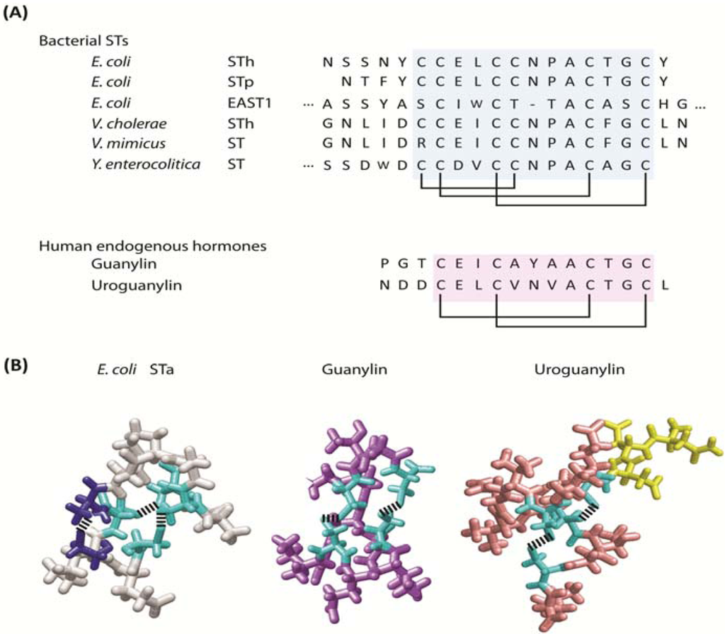 Bacterial heat-stable enterotoxin, guanylin and uroguanylin. (A) Primary structures of heat-stable enterotoxins produced by various pathogenic bacteria and human homologs, guanylin and uroguanylin. Conserved core regions are highlighted (blue for STs; pink for hormones) with disulfide bridges indicated; (B) Three-dimensional structures of E. coli STa (grey), guanylin (purple) and uroguanylin (pink) conserved regions. Non-conserved regions in uroguanylin are labeled in yellow. Cysteines linked by disulfide bonds conserved among three peptides are colored in cyan. Cysteines linked by the extra-disulfide bond, providing ST greater potency than guanylin and uroguanylin, are colored in blue.