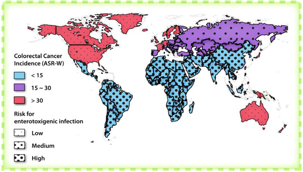 World map comparing the prevalence of enterotoxigenic bacterial infections and colorectal cancer. This map highlights the inverse relationship between the prevalence of enterotoxigenic bacterial infections and incidence of colorectal cancer worldwide. The prevalence of enterotoxigenic infections is represented by the intensity of dots while the incidence of colorectal cancer is represented by color. Adapted from [97].