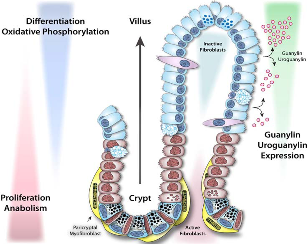GC-C signaling regulates homeostatic programs along the crypt-villus axis in the intestinal epithelium. The intestinal epithelium undergoes continuous regeneration and differentiation along the crypt-villus axis. Stem cells residing near the bottom of crypts give rise to rapidly proliferating progenitor cells, which subsequently differentiate into functional enterocytes. Guanylin and uroguanylin are secreted in a gradient along the crypt-villus axis, while guanylin is primarily secreted in colon and uroguanylin is mainly secreted in small intestine. Ligand activation of GC-C signaling reprograms proliferative and metabolic circuits in intestinal epithelial cells and ensures a homeostatic balance between proliferation and differentiation. Adapted from [84].