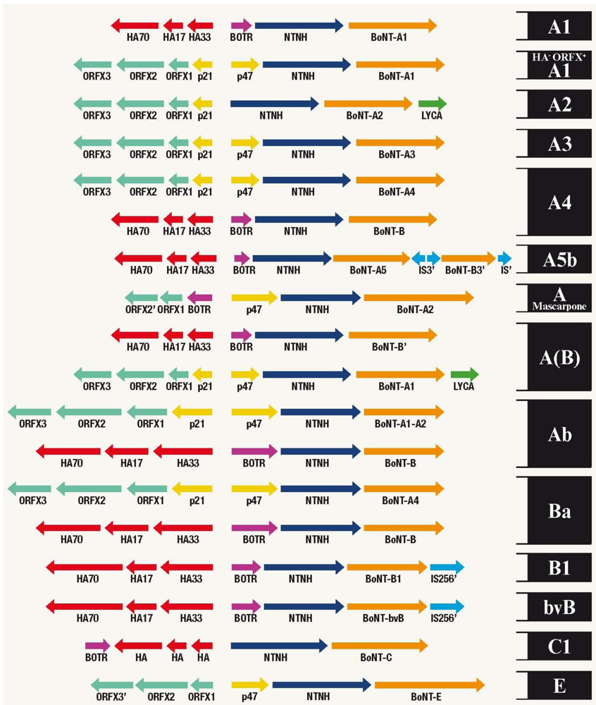 Arrangements of 18 BoNT gene clusters. Arrows indicate the respective positions and direction of genes identified in BoNT gene clusters. Gene nomenclature is provided beneath and strain identifications on the right. BoNT serotypes are indicated with a capital letter and subtypes by number. Silent genes are indicated in lower case. Partial genes are indicated with an apostrophe. Brackets indicate a second, partial sequence is expressed. HA, haemagglutinin; ORF, open reading frame; IS, insertion sequence; NTNH, non-toxic non-haemagglutinin. BOTR is a regulatory gene identified in the HA cluster [15,17,20,23,27,111,112].