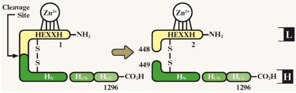 Schematic representation of BoNT-A domain structure. Proteolytic cleavage activates BoNT, yielding a di-chain protein joined by a disulfide bond. The heavy chain (green) is composed of domains: HN and the HC, which is involved in translocation of the light chain (L, yellow). The HC is further divided into two subdomains: HCN and the HCC, which is involved in neurospecific binding. The light chain possesses endopeptidase activity, with a zinc-binding motif (HEXXH). Numbers indicate amino acid residues within the complete neurotoxin gene [8]. H: Heavy chain; HN: Heavy chain N-terminal fragment; HCN: Heavy chain C-terminal fragment, N-terminal subdomain; HCC: Heavy chain C-terminal fragment, C-terminal subdomain; L: Light chain. Figure adapted from [8], permission obtained.