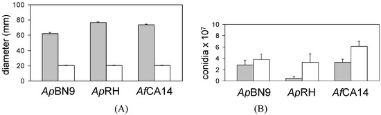 Effect of msnA disruption on colony size and conidial production. (A) Colony size after growth for five days at 30 °C. (B) Conidial production estimated from two cored agar plugs (see Materials and Methods 2.5). The gray bar represents the wild-type strain, and the clear bar represents the ∆msnA strain. Ap: A. parasiticus; Af: A. flavus.