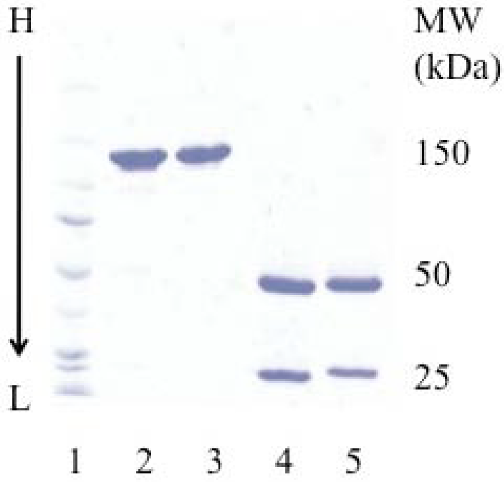 SDS-PAGE analysis of the purified cHD37 and HD37 MAbs. A 4–15% gradient gel was performed under non-reducing (lanes 2 and 3) and reducing (lanes 4 and 5) conditions. Lane 1: molecular weight markers; lanes 2 and 4: murine HD37; lanes 3 and 5: cHD37. This is one representative gel from three experiments.