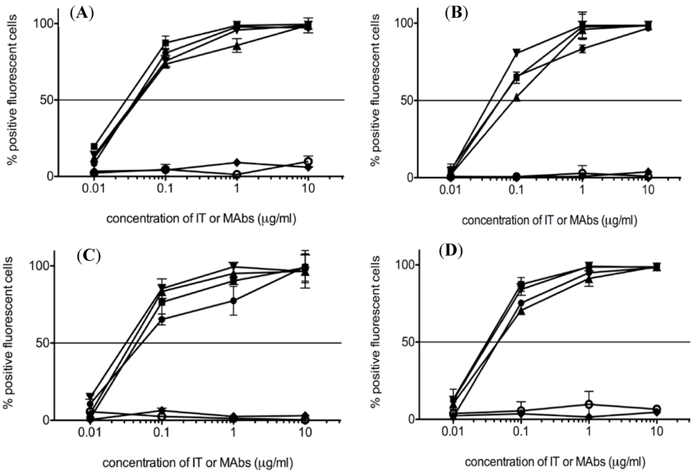 One million cells were incubated with dilutions of ITs or MAbs (0.01–10 μg/mL) followed by FITC-labeled goat anti-human Ig (GAHIg) under saturating conditions and analyzed on a FACSCalibur (Becton Dickinson, San Jose, CA). The percentage of positive cells was plotted against the concentration of IT or MAb.
