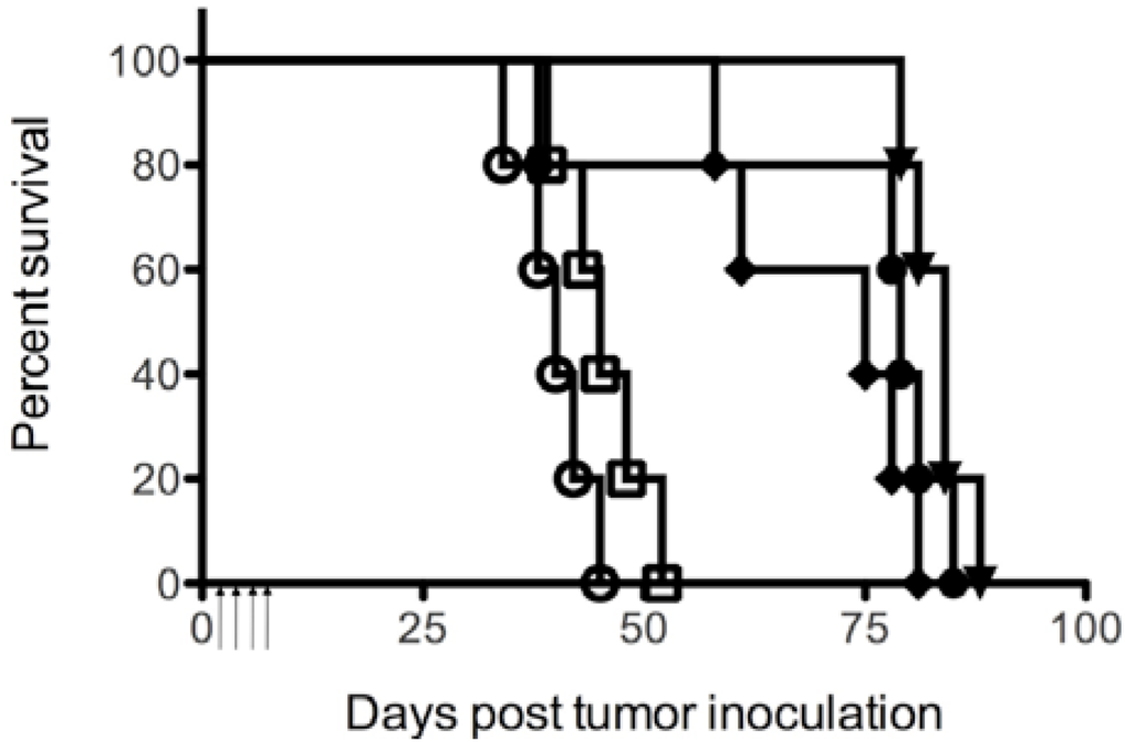 Therapeutic efficacy of the HD37 IT constructs in SCID mice with NALM-6 tumor cell xenografts. SCID/NALM-6 mice were treated on days 1 through 4 after tumor inoculation with the following ITs (5 mice per treatment group): open circles: PBS; open squares: RFT5-dgRTA; inverted triangles: HD37-rRTA; diamonds: cHD37-rRTA; circles: HD37-dgRTA. Arrows indicate treatment days (1–4). The graphs are representative of three separate experiments.