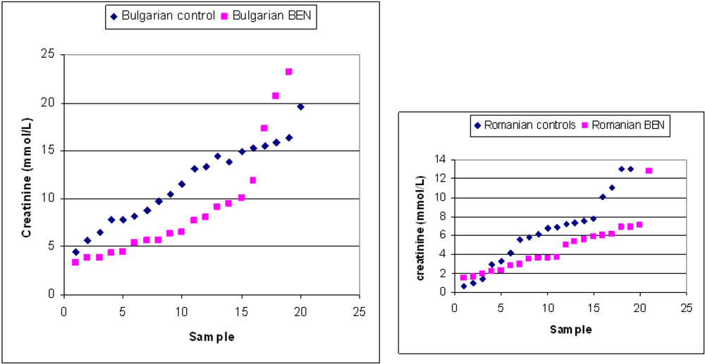 Tables 1–5 in Supplementary data. Considerable variation in creatinine concentration in controls from both Balkan countries and elsewhere is normal for human populations. An important factor is the extent of liquid intake in the preceding few hours. Therefore the rather similar distribution ranges, expressed both in the present apparently healthy controls (