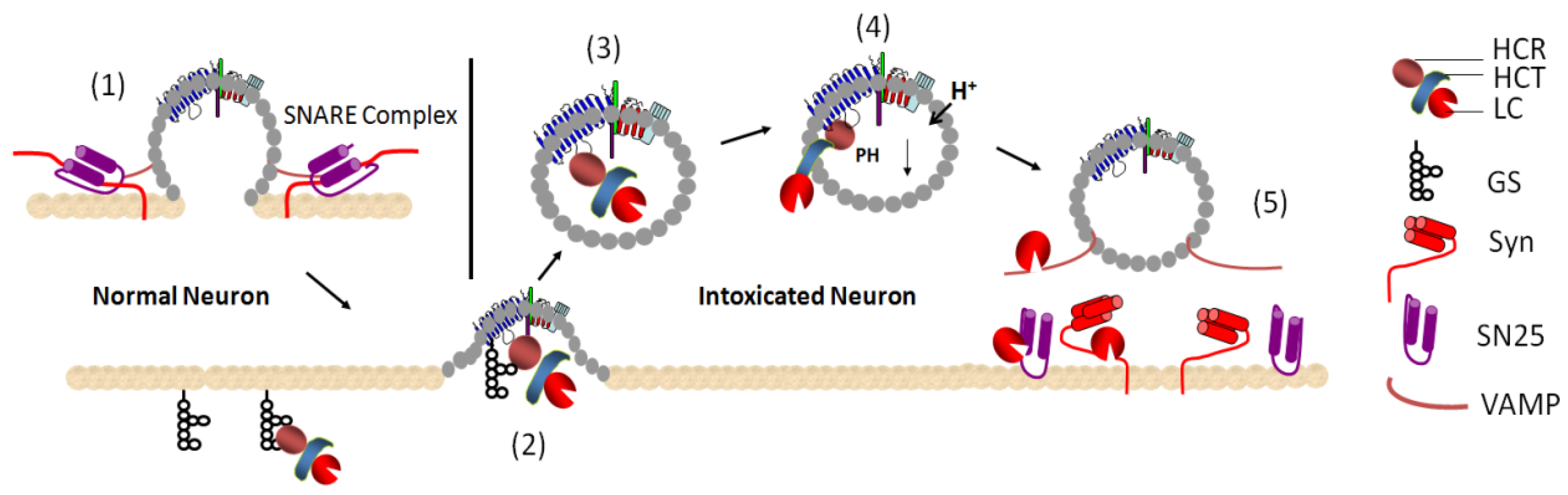 Multiple-step process of neuron intoxication by BoNTs. (1) In a normal neuron, neurotransmitter release is mediated by vesicle exocytosis facilitated by SNARE complex; (2) the HCR of BoNT binds gangliosides (GS) on the plasma membrane. Fusion of synaptic vesicles to the plasma membrane exposes loops of synaptic vesicles acting as BoNT protein receptor. The HCR binds to both GS and protein receptor simultaneously; (3) complexes of synaptic vesicle proteins are endocytosed to be recycled, which internalizes BoNT into neuronal cells; (4) the acidic environment triggers insertion of the HCT domain, which facilitates translocation of a partially unfolded LC (blue) through a channel made by the HCT (orange); (5) after translocation into the cytosal of a neuron, BoNT LC cleave SNARE proteins to inhibit exocytosis. Cleavage of VAMP2 and SNAP25 by LC/F and LC/A, respectively, is indicated. GS, gangliosides; Syn, syntaxin 1a; SN25, SNAP25; HCT, translocation domain (heavy chain); HCR, receptor binding domain (heavy chain); LC, light chain.