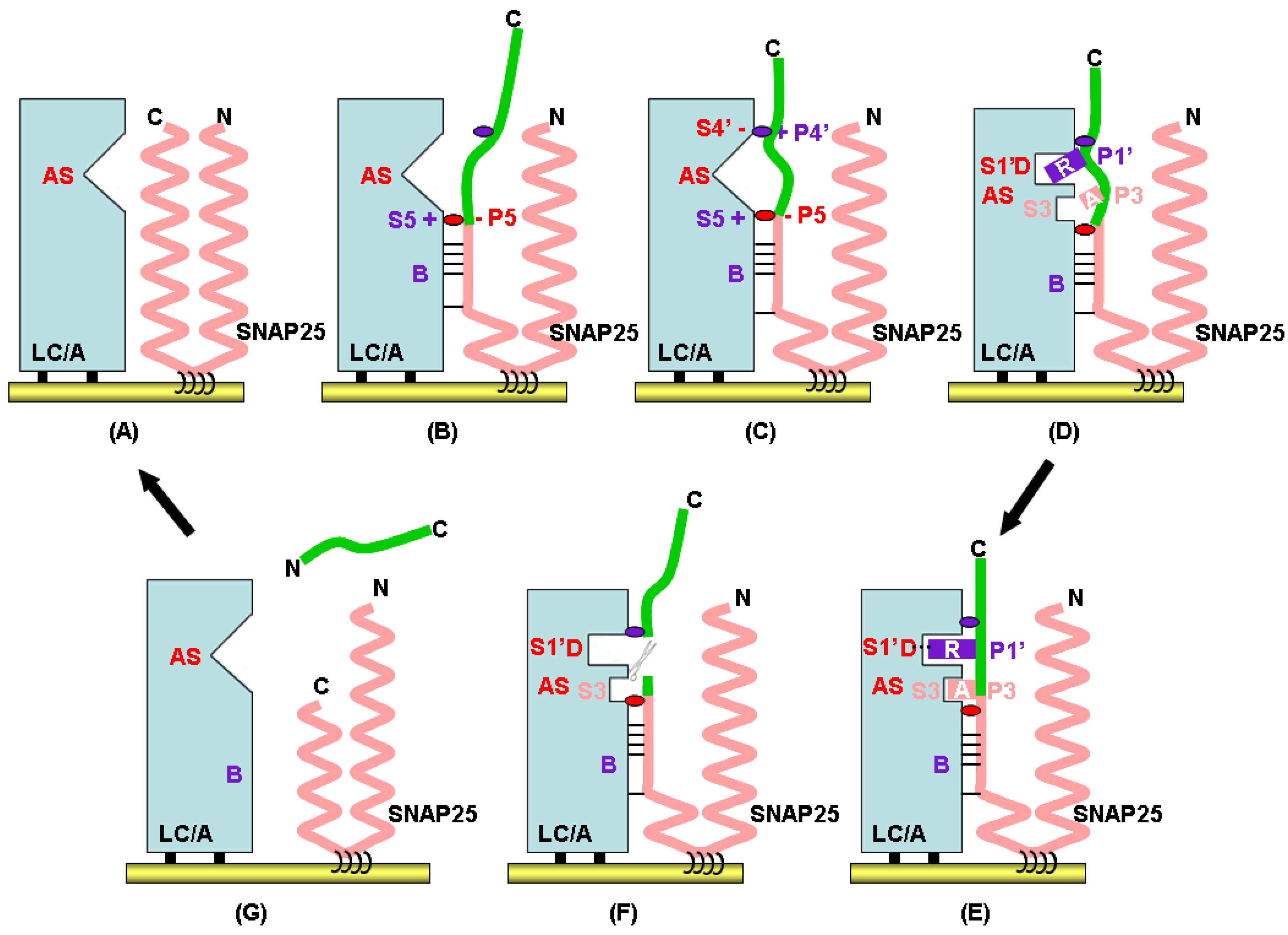 Decoding the complex structures of LC/A-SNAP25 and LC/F-VAMP2 depicted the mode of LC recognition of their substrates, SNAP25 or VAMP2 [41,42]. The recognition of SNAP25 by LC/A is mediated by exosites: the α-exocite binding is initiated by substrate binding distal to the AS and recognition of the SNAP25 scissile bond by the AS of LC/A. Further biochemical studies resolved the step-by-step binding and recognition of SNAP25 by LC/A [43]. The mechanism of LC/A recognition and cleavage of SNAP25 involves sequential steps representing SNAP25 recognition and active site organization. Initial interactions involve discontinuous surfaces between residues within the belt region of LC/A and the substrate binding (B) region residues of SNAP25. The Velcro-like binding of SNAP25 to LC/A aligns the P5 residue Asp193 to form a salt bridge with Arg177, an S5 pocket residue at the periphery of one side of the active site. Although the exact order of each step of recognition of SNAP25 by BoNT/A at the active site is not clear, the initial binding could subsequently orientate SNAP25 for the formation of a salt bridge between the P4'-residue SNAP25(Lys201) and the S4'-residue LC/A(Asp257). These interactions broaden the LC/A active site cavity and dock Arg198, the P1'-residue, via electrostatic and hydrophobic interactions within the S1'-pocket. The fine tuning of the alignment of Arg198 into the S1'-pocket resulting in the precise alignment of the scissile bond is facilitated by the binding of the P3 residue, SNAP25-Ala195, into the hydrophobic S3 pocket of LC/A. The proper docking of the P1'-P1 sites into the AS site initiates substrate cleavage. After cleavage, the P4'-residue dissociates from the S4'-residue of LC/A, which converts the AS into a smaller conformation, facilitating dissociation of the P1'-residue from the AS (Figure 3) [43].