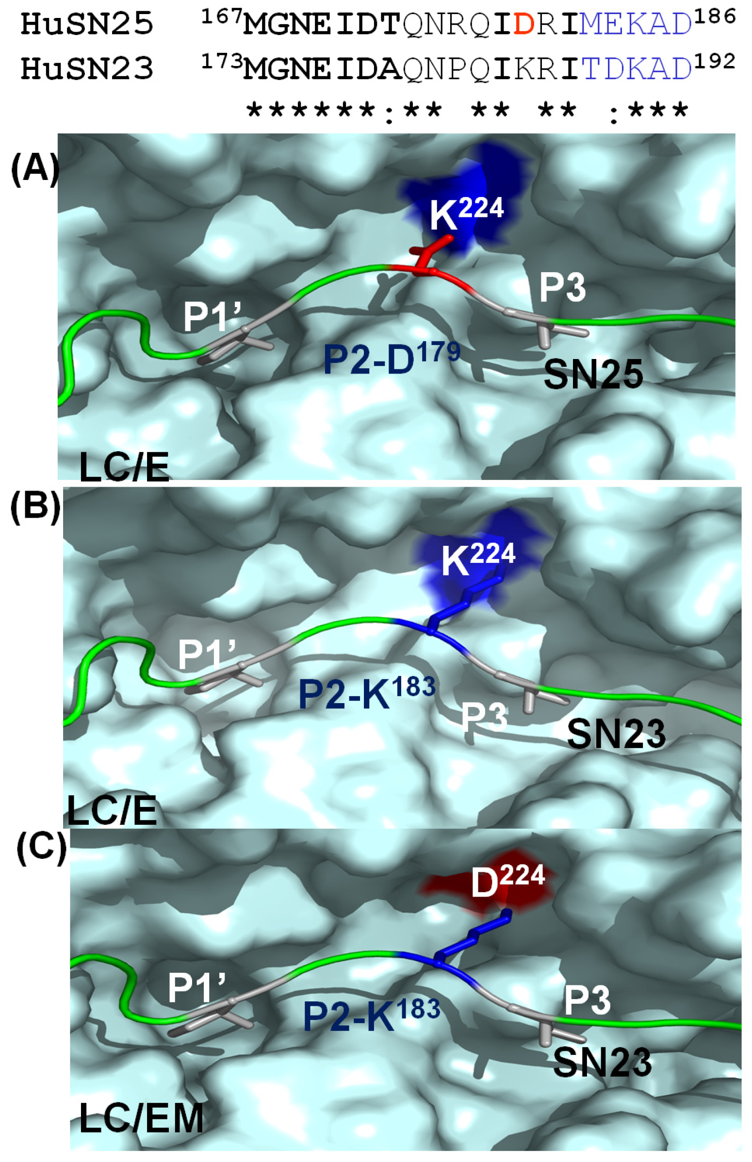 K185 of human SNAP23 contributes to substrate recognition by BoNT/E. (A) Recognition of D179 of SNAP25 by S2 pocket, K224 of LC/E; (B) inability to cleave SNAP23 by LC/E was due to the impairment of P2-S2 recognition; (C) Cleavage of SNAP23 by LC/E (K224D) by fine tuning the P2-S2 interaction.
