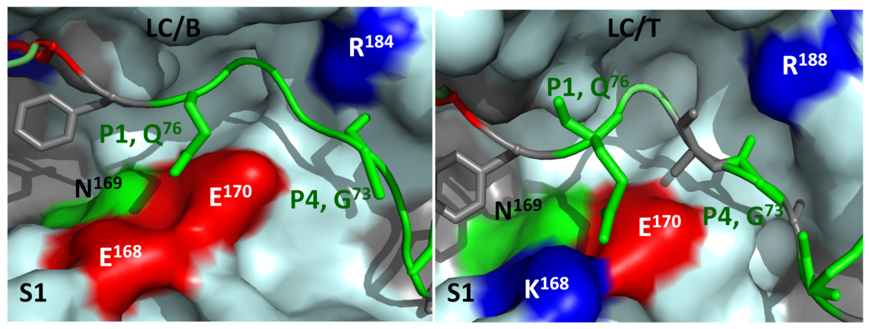 Optimization of LC/T substrate recognition pockets increases its catalytic activities. The S1 pocket of LC/B and LC/T formed by residues E168N169E170 and K168N169E170, respectively, recognizes P1, Q76 of VAMP2. Mutation LC/T K168E increases kcat by ~8 fold. The S4 pocket of LC/B and LC/T involves the residues R184 and R188. The mutation LC/T R188M increases kcat by ~5 fold.