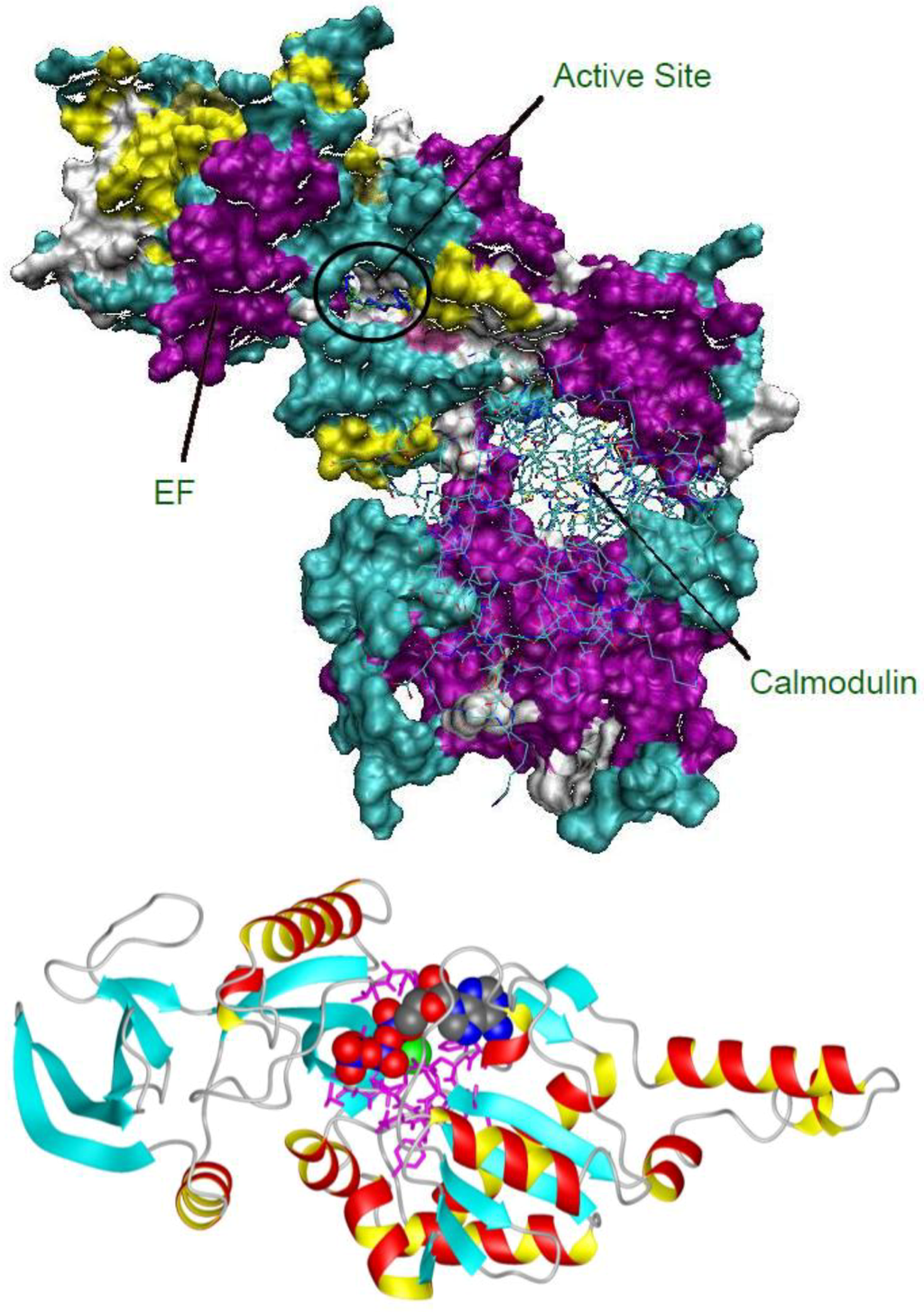 (Top) The overall structure of anthrax EF (plus calmodulin []) indicating the small area targeted by the inhibitors in this study; (Bottom) detail of the adenylyl cyclase domain of 1K90.pdb, with the Yb ion (green), and the inhibitor included in the co-crystal structure (3'dATP, colored according to atom type) shown as space filling. The magenta lines indicate residues of EF that surround the active (substrate binding) site.